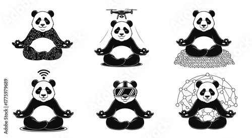Fototapeta premium Meditating panda silhouettes: technological and digital concepts with tranquil bears
