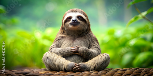 Naklejka premium Meditating sloth in a peaceful pose , Sloth, meditation, peaceful, relaxation, mindfulness, tranquil, calm, Zen, nature, forest, animal