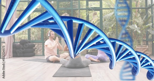 Naklejka premium Meditating three adults wearing athletic clothes on yoga mats in glass sunroom, blue DNA overlaying