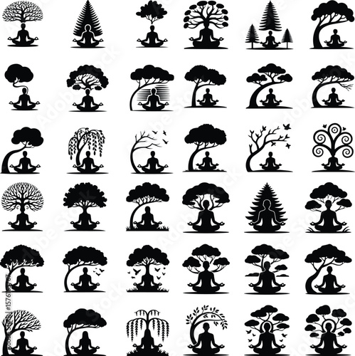 Fototapeta premium Meditation Under Tree Silhouette – Peaceful Yoga Icon Vector Set Zen Meditation Pose Under Tree – Spiritual Silhouette Illustration Pack