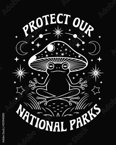 Obraz premium Meditative Frog Under Mushroom with Celestial Forest Motif