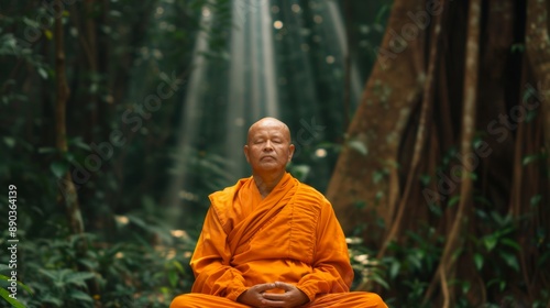 © Nattanon, Fototapeta premium Meditative monk in an orange robe meditating in the serene forest with sunlight filtering through the trees.