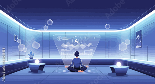 © Jati, Naklejka premium Meditative State In Futuristic Room Using Artificial Intelligence Interface