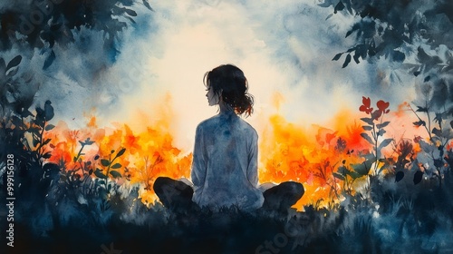 © Tatiana Vagizova, Obraz premium Meditative Woman in Nature at Sunrise Generative AI