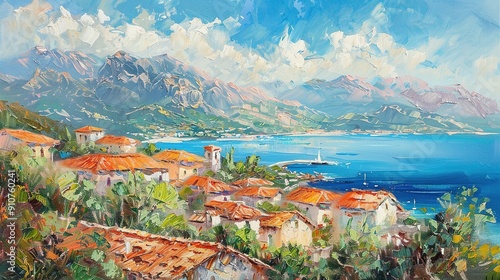 © Armando, Fototapeta premium Mediterranean Coastal Village with Mountains and Sailboat