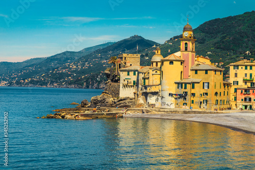 Naklejka premium Mediterranean coastline and Camogli resort with colorful buildings, Liguria,...