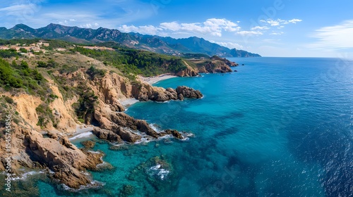 © Awais, Fototapeta premium Mediterranean Coastline Panoramic Aerial View of Secluded Beach and Azure Waters