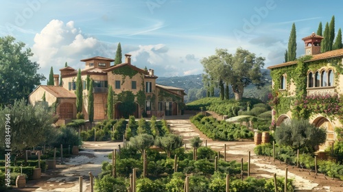 Fototapeta premium Mediterranean estate with a private vineyard and olive grove, showcasing traditional architecture and tranquil scenery