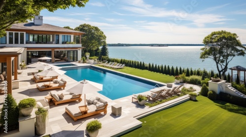 © Damian Sobczyk, Obraz premium Mediterranean inspired villa with a sprawling garden and a private beach access in the exclusive Hamptons, New York