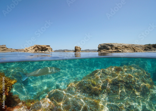 Fototapeta premium Mediterranean seascape, rocky coastline with fish underwater, split view over and under sea surface, Spain, Costa Brava, Catalonia, El Port de la Selva, Cap de Bol