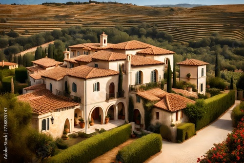 Obraz premium Mediterranean villa overlooking a vineyard, with terracotta roofs and arched...