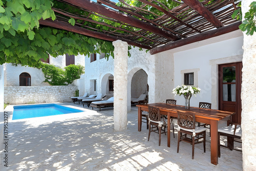 Obraz premium Mediterranean villa patio with pool, dining table, and pergola
