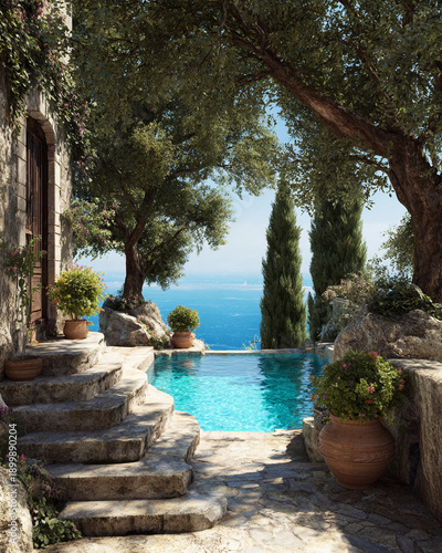 Fototapeta premium Mediterranean villa terrace with pool and sea view, lush garden