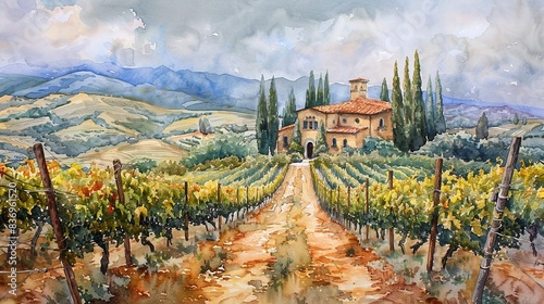 Naklejka premium Mediterranean Vineyard Soft pastels, rolling vineyards, Watercolor, Rustic,...