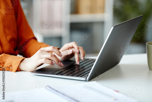Fototapeta premium Medium close-up of unrecognizable young woman working in Internet texting on laptop in office
