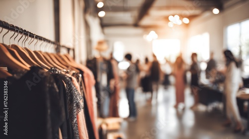 Fototapeta premium Medium closeup of a stylish popup shop interior in an urban setting highlighting unique merchandise sharply framed against blurred customers and decor.