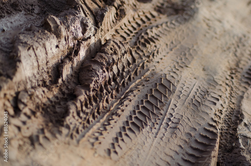 Obraz premium Medium CU motorcycle and car tracks in mud