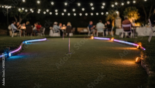 Naklejka premium Medium shot featuring a nighttime putting green with colorful path lighting and blurred background elements emphasizing a relaxed social gathering vibe.