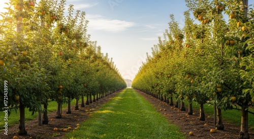 © DigitalSpace, Naklejka premium Medium shot of a neatly arranged orchard showing trees planted in evenly spaced rows for maximum sunlight exposure and easy maintenance