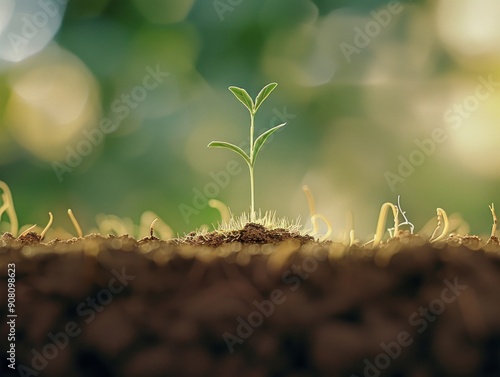 © Садыг Сеид-заде, Fototapeta premium Medium shot of A slice of the earth, a side view, a sprout on the earth, roots entwine the sprout, grass grow on top, themed background,