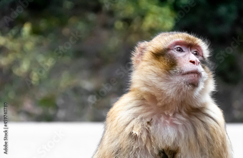 © Sandra, Fototapeta premium Medium shot of macaque monkey in the wild with blank stare and soft blur background