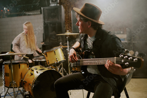 Fototapeta premium Medium shot of mature Caucasian man playing electric bass guitar in modern rock band, copy space