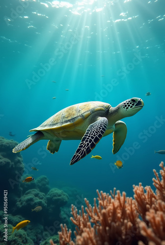 Obraz premium Meeresschildkröte schwimmt über Korallenriff