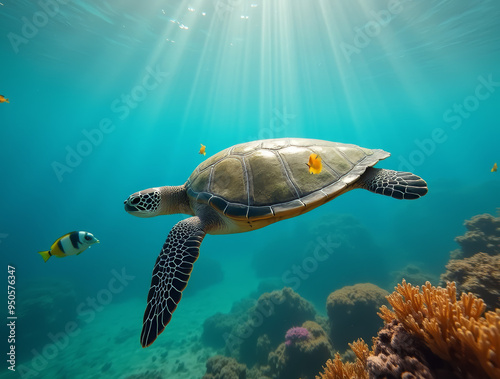 Obraz premium Meeresschildkröte schwimmt über Korallenriff