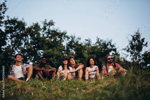 © master1305, Obraz premium Meet sunset. Group of friends, young men and women walking, strolling together in summer forest, meadow outdoors. Active lifestyle, friendship