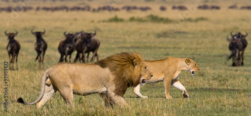 © gudkovandrey, Naklejka premium Meeting the lion and lioness in the savannah. National Park. Kenya. Tanzania. Masai Mara. Serengeti. An excellent illustration.