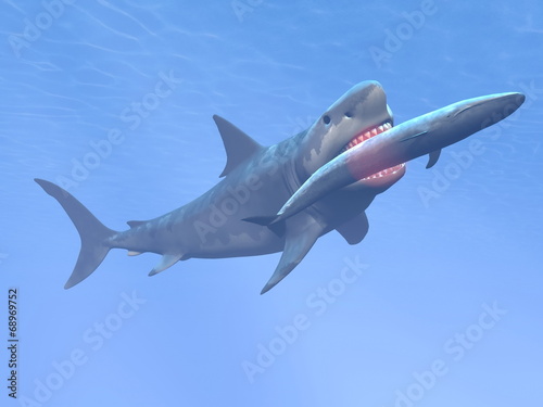 Fototapeta premium Megalodon shark eating blue whale - 3D render