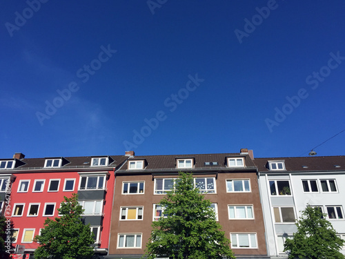 © bevisphoto, Fototapeta premium Mehrfamilien Hausfront vor blauem Himmel
