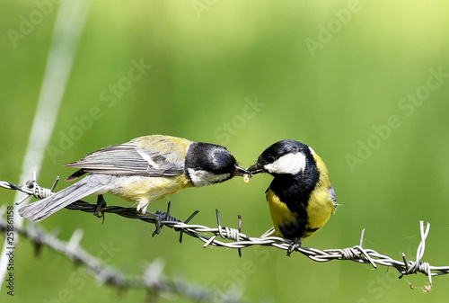 Obraz premium Meisenkind bei der Fütterung auf einem Draht sitzend