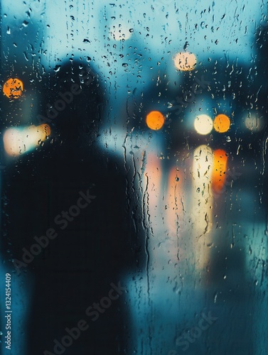 © Anat art, Obraz premium Melancholic raindrops create a reflective moment with a lonely figure against blurred city lights in soft blue and gray hues