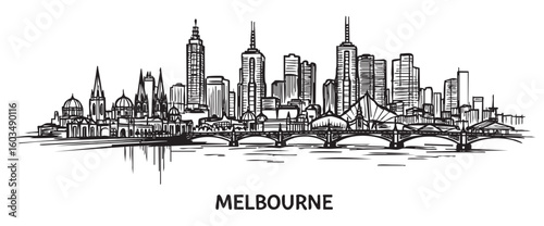 © tarakacraft, Obraz premium melbourne australia cityscape tall building engraving sketch vector illustration