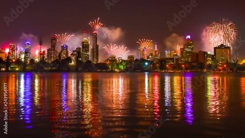 Fototapeta premium Melbourne NYE Fireworks viewed from Albert Park Lake.