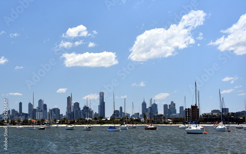 © katacarix, Fototapeta premium Melbourne skyline from St Kilda (Victoria Australia). View from a wooden jetty over the city of Melbourne in the Port Phillip Bay in Victoria and many yachts on the quay.