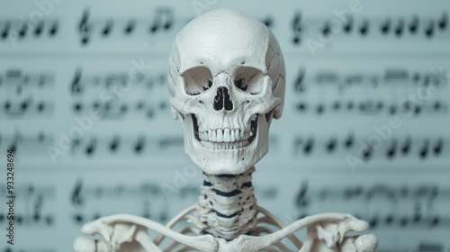 Fototapeta premium Melodic Skeleton - Conceptual Image of Human Skeleton Intertwined with Musical Notes Symbolizing Harmony and Rhythm, Copy Space Available for Text, High Detail 8K Resolution