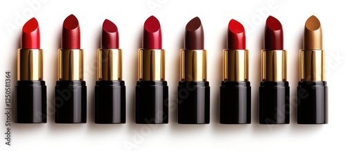 © NFTNexus, Obraz premium Melting lipsticks in a row on a clean white background showcasing vibrant colors and textures of cosmetic products