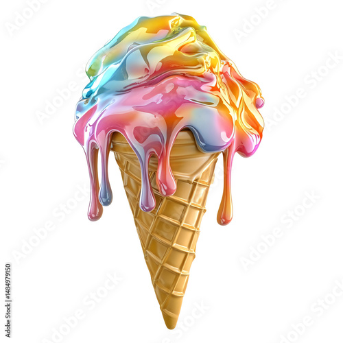 © ASyarif, Naklejka premium Melting rainbow ice cream cone isolated on transparent or white background. Generative ai
