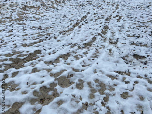 © Anastasiia, Obraz premium Melting snow on the sandy earth.