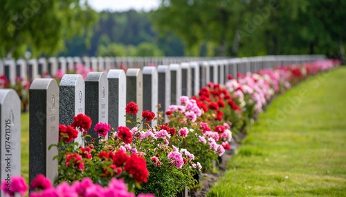 © zerogami, Fototapeta premium Memorial graves with roses with honoring fallen soldiers in a serene cemetery.