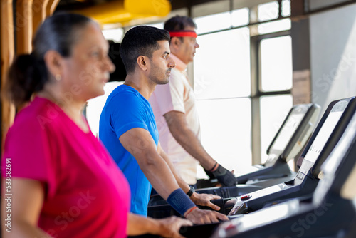 Obraz premium Men and woman in sportswear doing cardio workout at gym