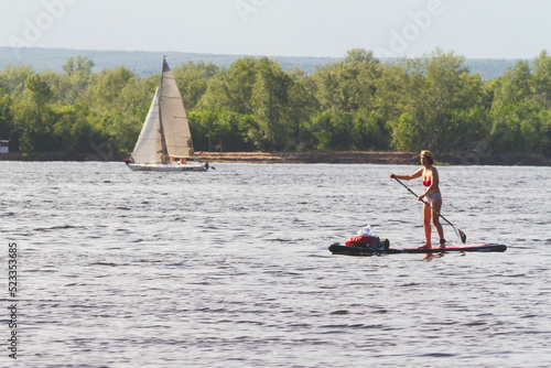 Naklejka premium Men, friends ride SUP boards on a big river during sunrise.
