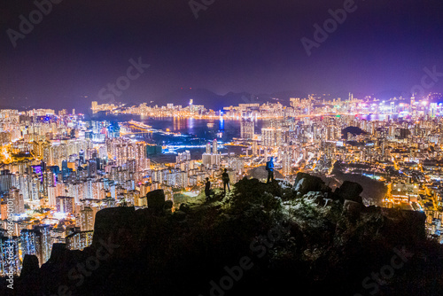 © gormakuma, Fototapeta premium Men hiking at the Lion Rock Peak, Hong Kong night view, panorama from Kowloon district to Hong Kong Island, Asis