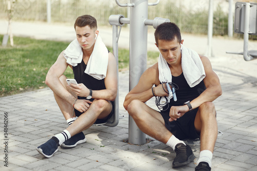 Obraz premium Men in a city. Guys in a sports clothes. Male with phone and headphones