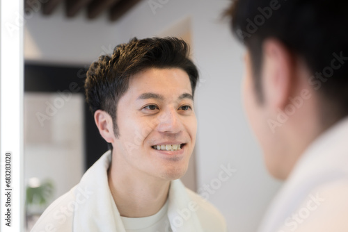 © kapinon, Fototapeta premium Men looking in the mirror and worrying about their teeth.