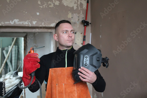 © OlTarakanov, Fototapeta premium Men's chores, men's daily work tasks. A man welder, a man before work with an electrode and clothing.