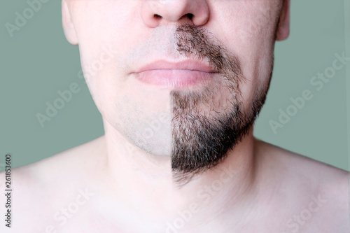 © Svetlana, Obraz premium Men's short beard and lips close-up. Half-trimmed beard on the man's face . Light green background.