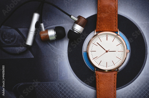 Fototapeta premium Men's watch with headphones. Luxury watches for a businessman